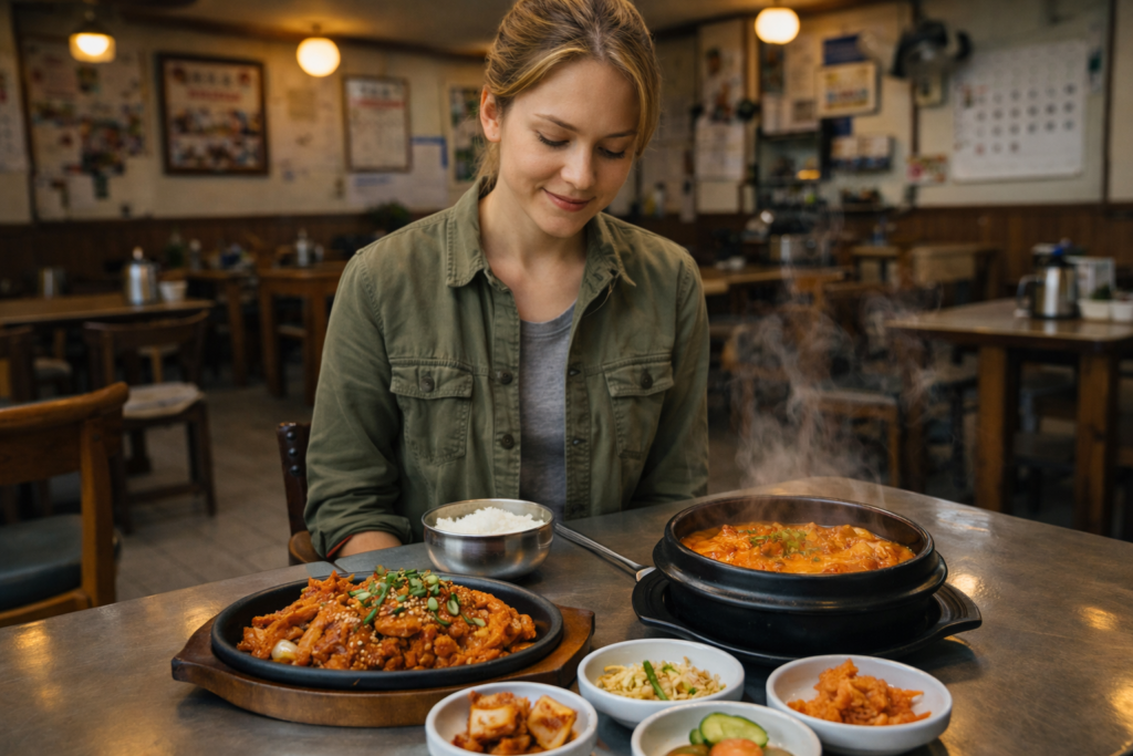 For first-time solo female travelers, I usually recommend this order: donkatsu → kimchi stew → jeyuk-bokkeum → baekban. It builds confidence step by step.