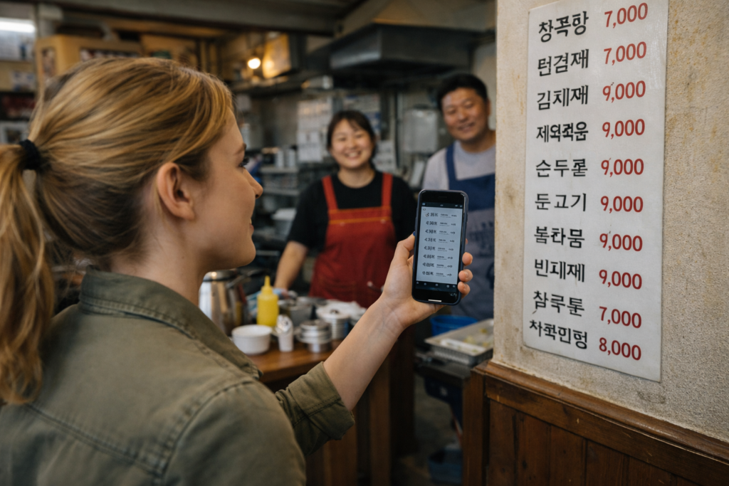 Use Papago or your phone camera translator. Or point to a photo on the wall menu. In these restaurants, speed matters more than perfect pronunciation.