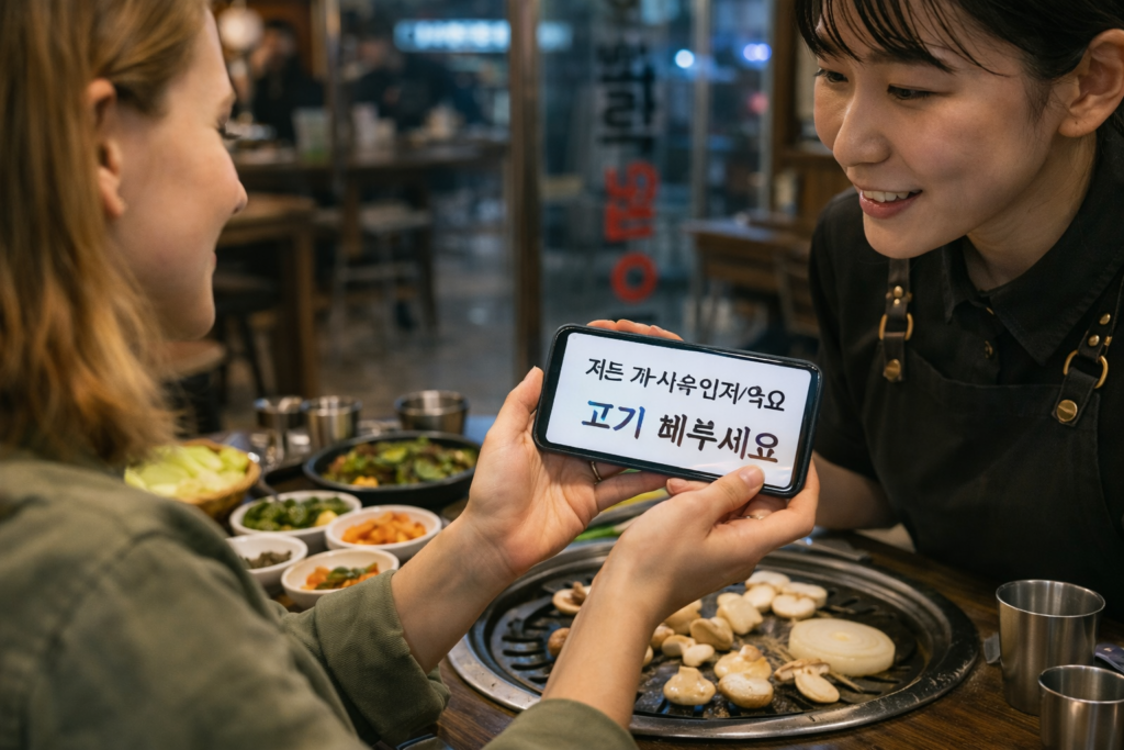 My personal tip: Screenshot your Korean phrase in large font on your phone. In noisy BBQ restaurants, showing text is often faster than speaking.