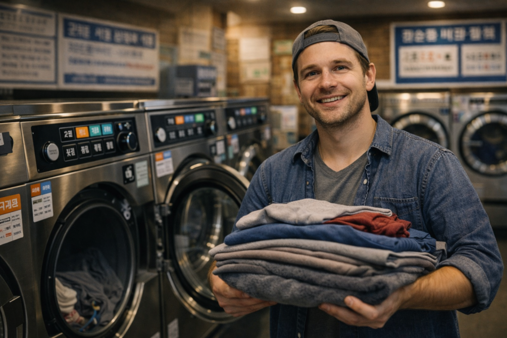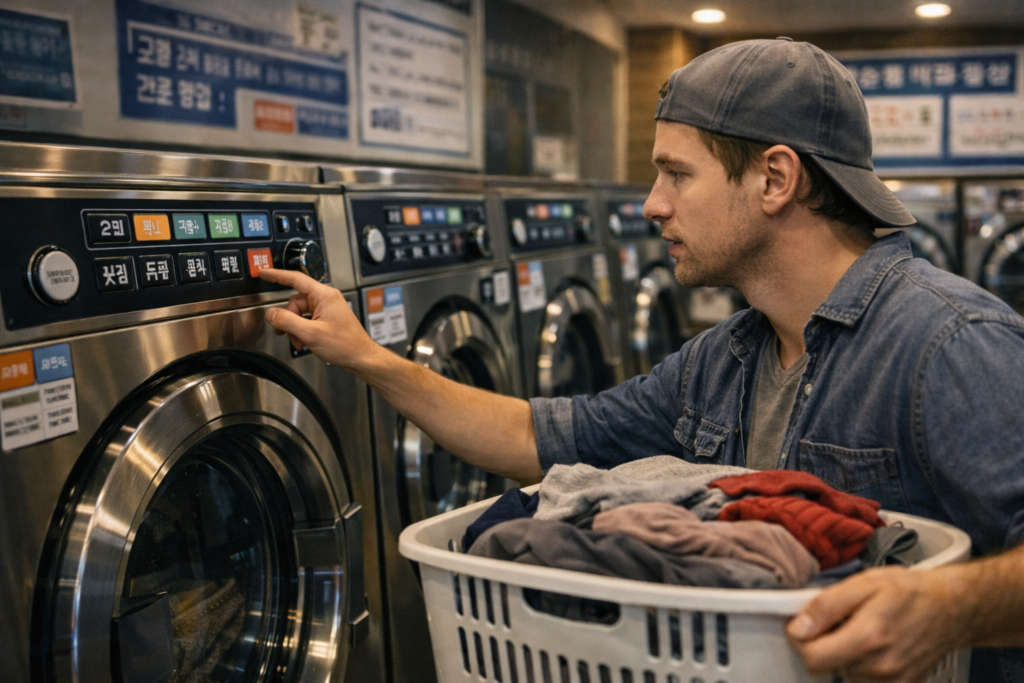 Standing in a Korean coin laundry with a bag full of dirty clothes and a machine covered in Korean text? I have been there. The first time, I stared at the control panel for five full minutes and still could not tell whether I was about to start a normal wash or something far more aggressive.