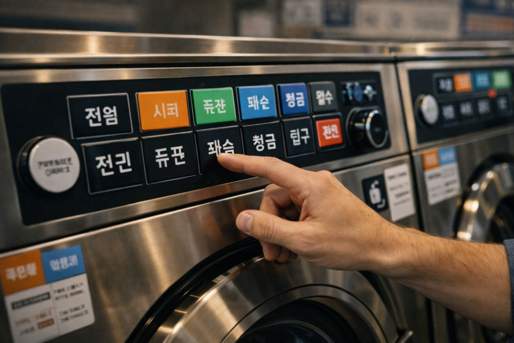 Korean coin laundries look intimidating at first, but they become simple once you learn the repeat-button logic. Focus on the basics: 전원, 시작, 표준, 헹굼, 탈수, and 건조. That small vocabulary gives you a huge travel advantage.