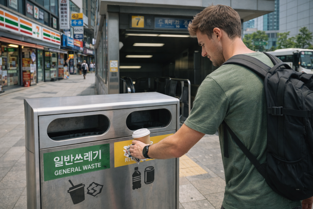 Korea’s waste system is built around separation, recycling, and proper disposal. For visitors, this can make disposal feel less casual than in cities where every corner has a general-purpose bin.
