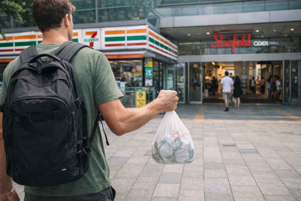 If you bought the drink or snack there, this is often the easiest solution. Many travelers forget that the most practical “English-friendly trash can” in Seoul is not always a city bin. It is often a convenience store disposal area. Staff may expect you to discard only store-related waste, so be polite and use common sense.